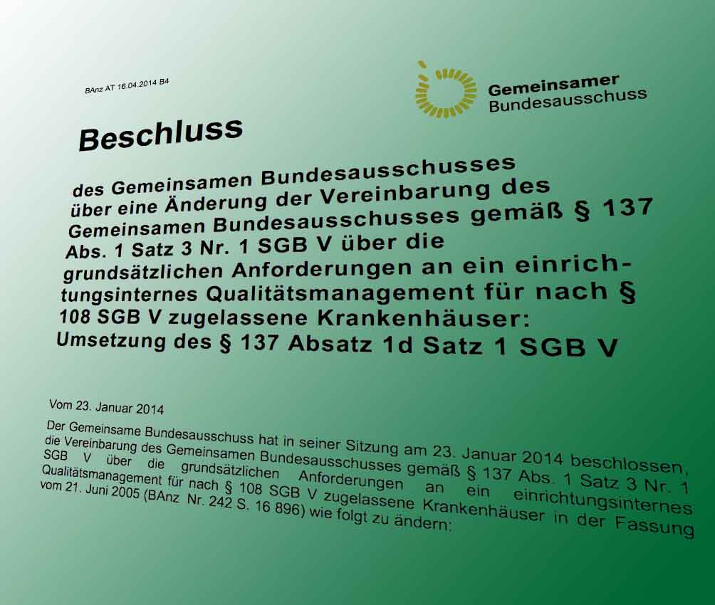 Der G-BA bezieht sich auf den § 137 Absatz 1d Satz 1 SGB V. Diese Vorschrift zur Verbesserung der Rechte von Patienten wurde bereits im Jahr 2013 veröffentlicht. Daher gilt der Beschluss vom Januar 2014 als Ergänzung.